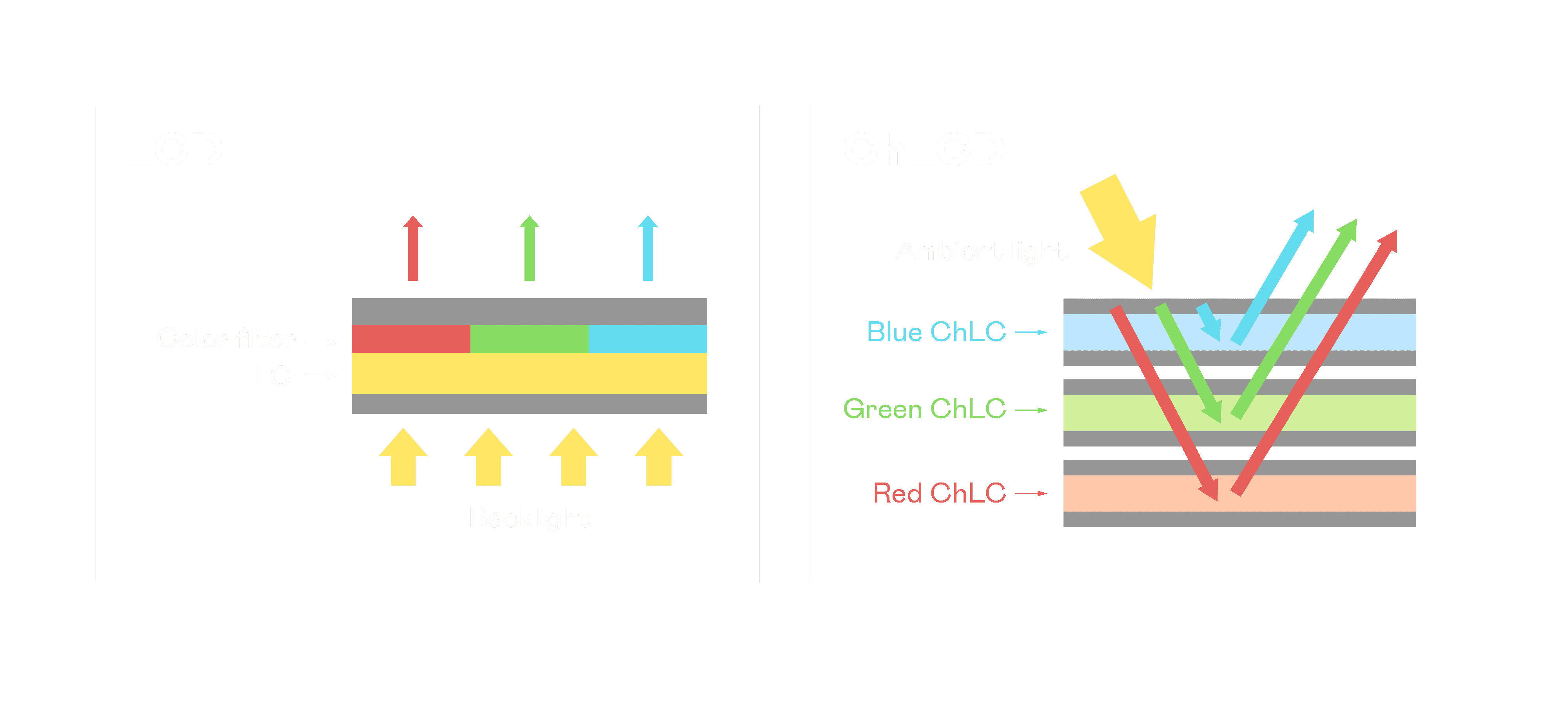 ChLCD 胆固醇液晶就如同纸张一样,,透过反射环境光来显示影像,,,,因此长时间观看不易造成人眼视觉疲劳,,,,可达到护眼效果。。。。当处于户外阳光下使用,,,,LCD 影像容易失真而不易观看,,,,但胆固醇液晶仍可维持较佳的影像品质。。