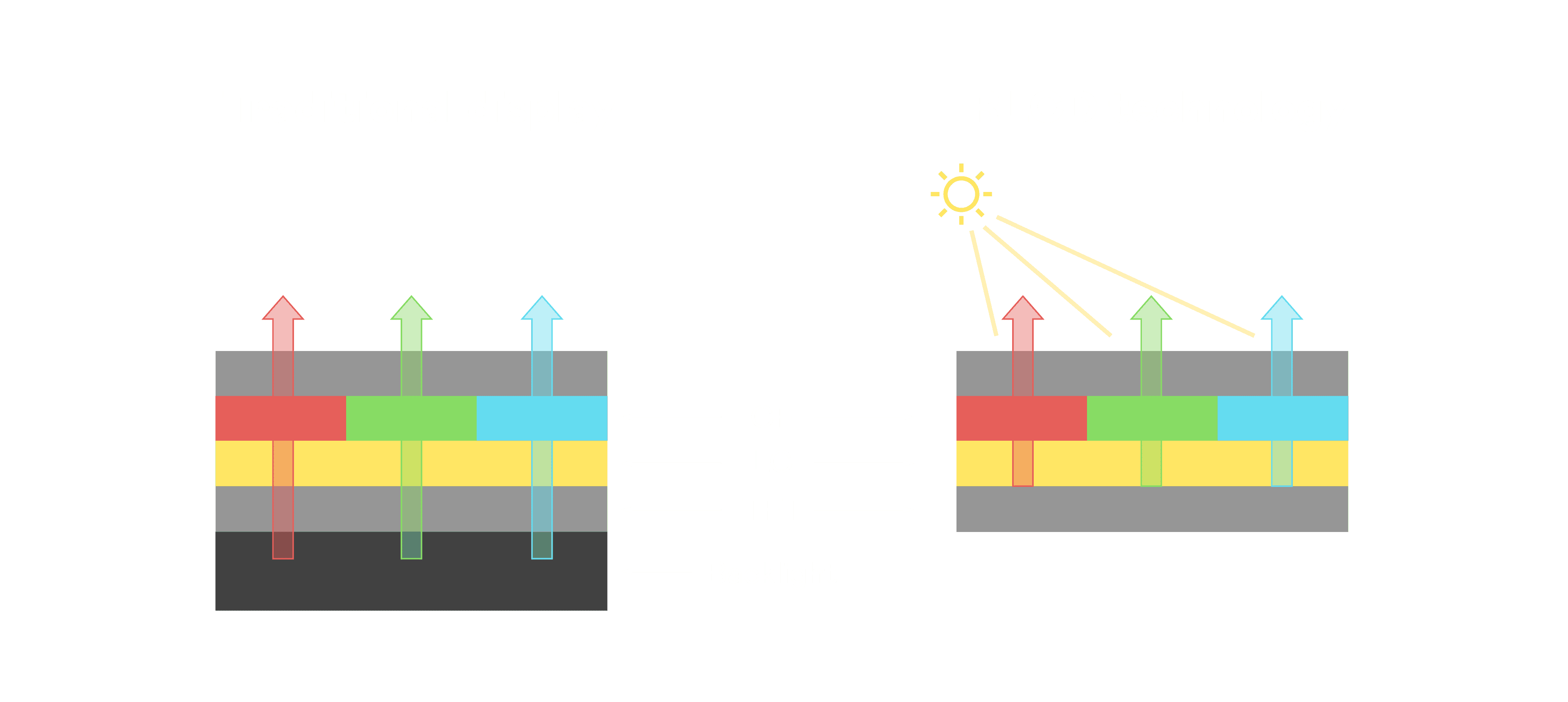 与传统需搭配背光单元的液晶显示相比,,,反射式液晶技术不仅更省电、、更轻薄,,且即便在艳阳下仍能清晰显示。。。。此外,,少了背光单元,,,也大幅降低了 LED 蓝光伤害眼睛的疑虑。。。。
